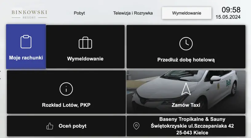 Pełna personalizacja interfejsu, dostosowanie pod indywidualne potrzeby klienta, wybór języka, informator hotelowy, integracja z PMS, komunikacja z recepcją.